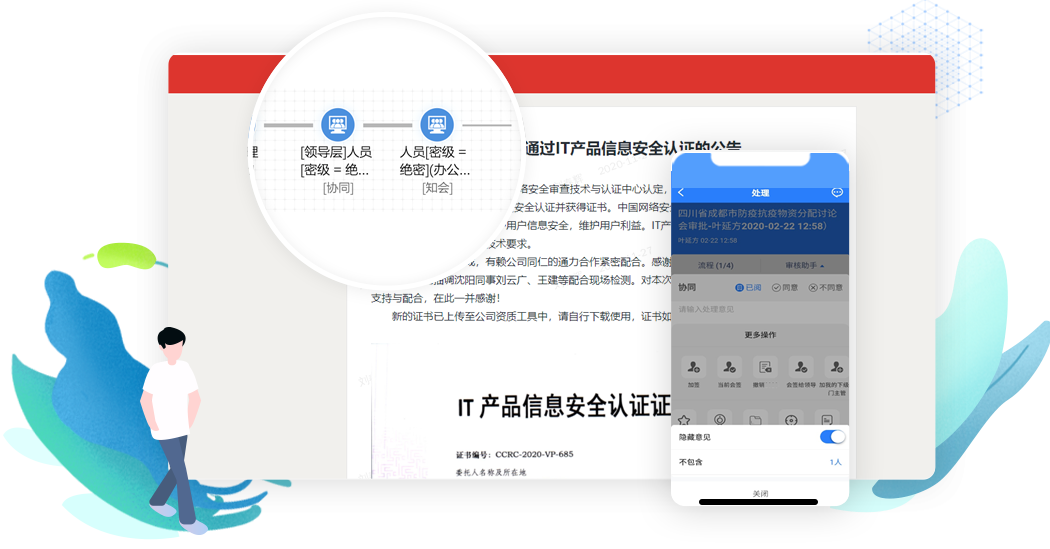 基于组织中人、部门、岗位、角色进行流程流转及分支条件匹配,构建基于组织结构的流程体系。同时,支持新闻/公告/会议纪要/文档权限等经过流程审批后生效