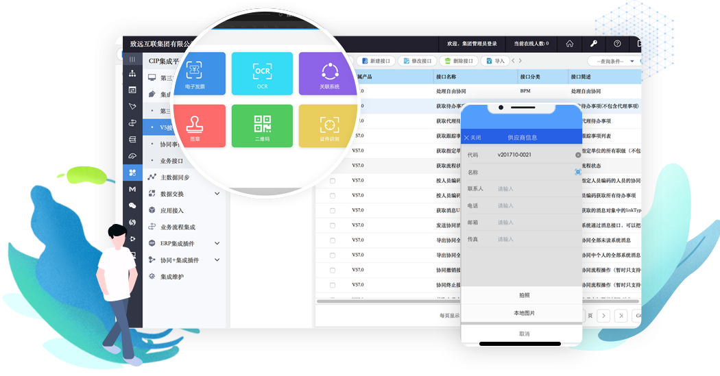 通过接口,实现与ERP等第三方系统的待办集成、消息集成、财务凭证、业务集成,支持双向流程集成