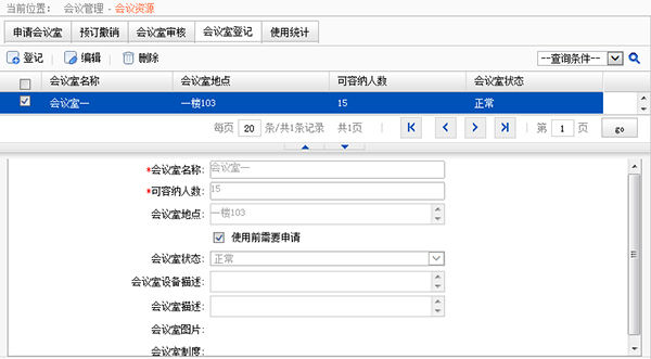 平台拟提供会议资源的登记处理,登记信息中涵盖了会议室名称、会议室地点、状态、会议室设备、是否需要审批,可容纳人数等基本信息。