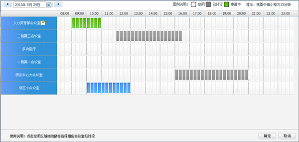 平台提供图形化的会议室申请界面,直观展示会议室占用状态,申请时间冲突自动提醒。用户只用拖动鼠标,即可完成会议室的申请,如下图