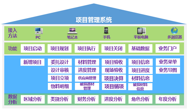 2、工程项目管理:从传统手工粗放式管理向精细化管理进行转变,通过业务搭建,实现从项目设计委托、审核;项目立项、用料计划到项目变更、项目验收、项目决算等关键内的应用