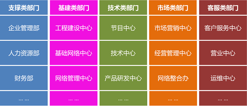 根据职能分工不同,广电企业一般分为支撑类、基建类、技术类、市场类、营销类等分类,不同职能之间分工合作,同时有又相互联系。常见分类如下图,通过下图可以看出,办公系统应用可以涵盖全企业、全部门。针对不同的业务部门均有比较特色的审批业务。下文针对各业务线特色业务进行举例说明。实际应用不限于所举示例。
