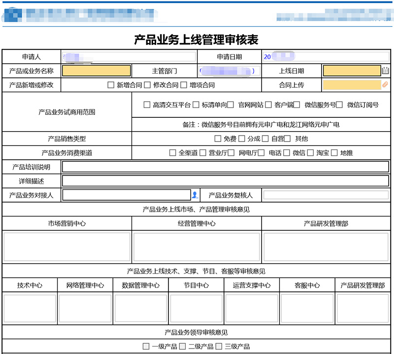 产品业务上线管理审核表