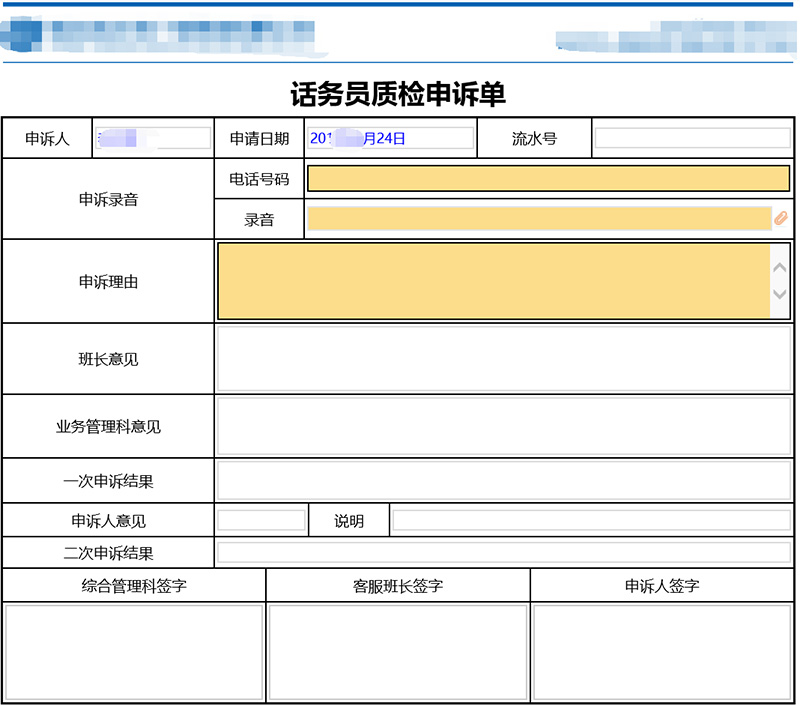 话务员质检申诉单