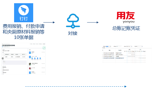 某餐饮管理连锁店(以下简称客户),分子公司、连锁店主要分布在河南郑州、商丘等城市。客户使用用友T+进行财务管理。客户在钉钉中设置了费用报销、付款申请和央厨原材料报销等10个单据审批流程,涉及到的员工使用人数约300人。