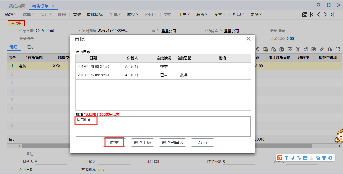 (8)当客户“星星公司”信用余额不足时,业务员审单后,会继续再流转到上级领导处审批;