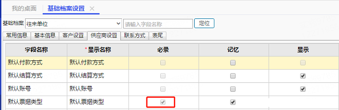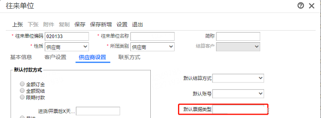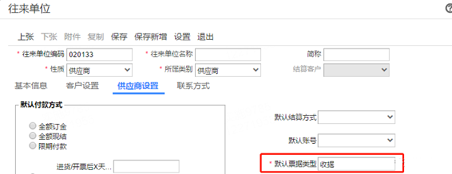由于单据上的票据类型是和往来单位关联,避免由于往来单位中默认票据类型没有录入,导致录入单据的时候初始票据类型有问题,造成数据影响,进而将往来单位中,默认票据类型设置为必填。