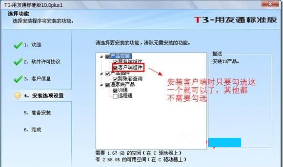 (1)如果安装的时候安装的是完整版本,需要卸载软件之后重新安装客户端版本的软件,安装时注意选择,客户端组件,其他都不需要勾选,如下图所示:用友T3客户端安装教程还可以参考一下: