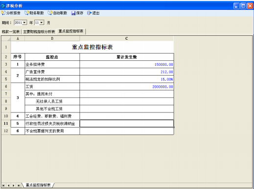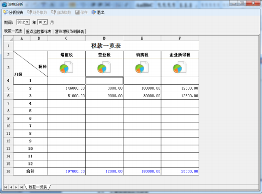 包括以下页签:税款一览表、重点监控指标表、营改增税负测算表