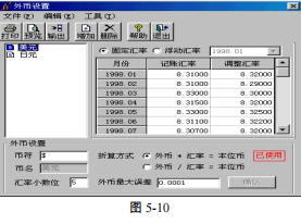 汇率管理是专为外币核算服务的。在此可以对本账套所使用的外币进行定义;在【填制凭证】中所用的汇率应先在此进行定义,以便制单时调用,减少录入汇率的次数和差错。当汇率变化时,应预先在此进行定义,否则,制单时不能正确录入汇率,对于使用固定汇率(即使用月初或年初汇率)作为记账汇率的用户,在填制每月的凭证前,应预先在此录入该月的记账汇率,否则在填制该月外币凭证时,将会出现汇率为零的错误,对于使用浮动汇率(即使用当日汇率)作为记账汇率的用户,在填制该天的凭证前,应预先在此录入该天的记账汇率。进入本功能后,屏幕显示如图 5-10: