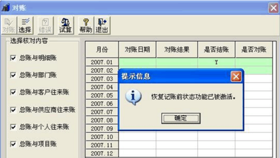 2、 在弹出的窗口中,直接按Ctrl+H组合键,弹出一个提示“恢复记账前状态功能已被激活”,再点击〖确定〗按钮
