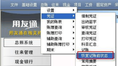 3、 退出上面的窗口后,再依次点击总账——凭证——恢复记账前状态。