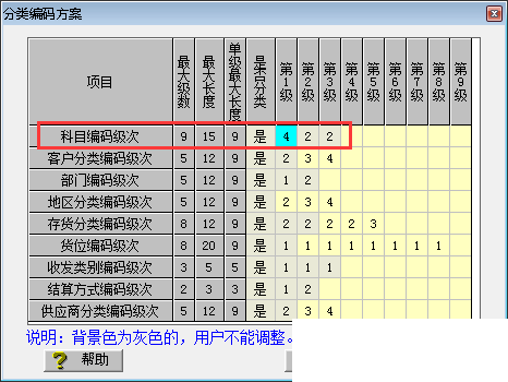 · 科目编码级次: 用友T3软件中最大限制为九级十五位,且任何一级的最大长度都不得超过九位编码。一般单位用32222即可。用户在此设定的科目编码级次和长度将决定用户单位的科目编号如何编制。例如某单位将科目编码设为32222,则科目编号时一级科目编码是三位长,二至五级科目编码均为两位长;又如某单位将科目编码长度设为3332,则科目编号时一级科目编码为三位长,二级科目编码为三位长,四级科目编码为两位长。