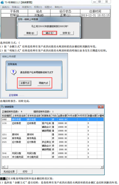 2)选择按“明细方式”进行结转:是指将所有客户或供应商的未两清核销的明细以业务发生日期(凭证的制单日期)结转到新的年度作为期初。建议:如果要进行往来账龄分析,请选择“按明细方式结转”,并在结转之前做好两清核销。