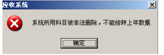 问:进行应收应付结转时,系统提示“系统所用科目被非法删除,不能结转上年数据”。如下图所示。