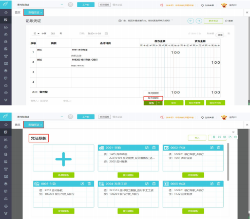 2、如果需要将凭证保存为凭证模板,可击填制凭证右下角的【模板】-【存为模板】。如需使用模板,可点击【模板】-【使用模板】进入凭证模板界面,选择需要的模板点击【使用模板】。