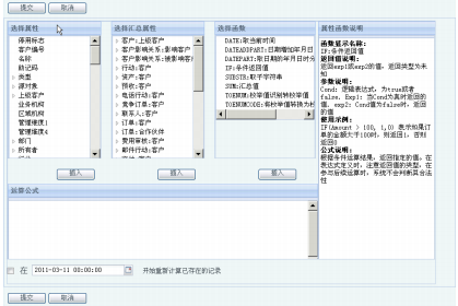 根据属性函数说明,选择所需函数插入到运算公式中,将属性插入函数中。可参与预算的属性类型包括:数值型、百分比、货币型、日期型。还可以设置开始重新计算已存在的记录的时间。