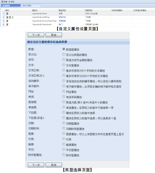 [排序]:点击后打开属性排序页面(包括系统属性和自定义属性)。在销售机会属性设置页面,点击自定义属性选项卡切换到自定义属性列表页面,点击[新建]按钮,进入自定义属性类型选择页面。