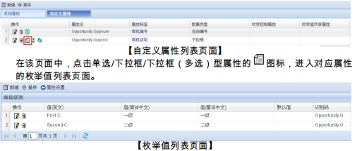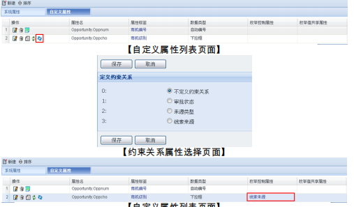 点击系统配置菜单“客户化平台 ”“对象管理 ““销售机会”,进入销售机会属性设置页面。在该页面,点击自定义属性选项卡切换到自定义属性列表页面。