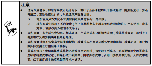 成本管理提供手动卷积(成本计算)与自动卷积两种方式计算各层半成品成本,满足不同用户使用需要。卷积运算是自动卷积的一种,可一次性按顺序由低层到高层完成所有 BOM 层次成本计算,包含各层入库单、出库单记账、期末处理、材料及外购半成品耗用表取数、成本计算、产成品成本分配,在计算过程中无交互操作。卷积运算时可支持存货的计价方式主要有:移动平均、全月平均、先进先出、后进先出、计划价。卷积运算时意外断电或点〖取消〗按纽,卷积计算回滚到此次计算前状态,自动根据回滚范围对存货管理进行相应的取消月末处理、恢复记账、产成品成本分配。果出现数据变更或操作错误,可以点〖恢复〗按纽,系统自动恢复卷积过程中进行的各种操作,包括恢复存货期末处理、恢复存货记账、恢复产成品成本分配。未进行〖恢复〗,而直接再次进行卷积计算,与上次计算生成的产成品入库单的差异,系统将自动生成相应入库调整单。