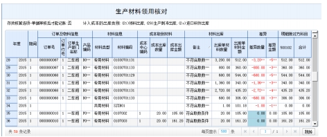 按订单行号(按品种核算时按 BOM 号)+成本中心对材料出库单单据进行汇总,与当月实际成本对象或成本中心领用材料总金额进行差异比较,同时对展开材料明细的数量与金额作核对比较。