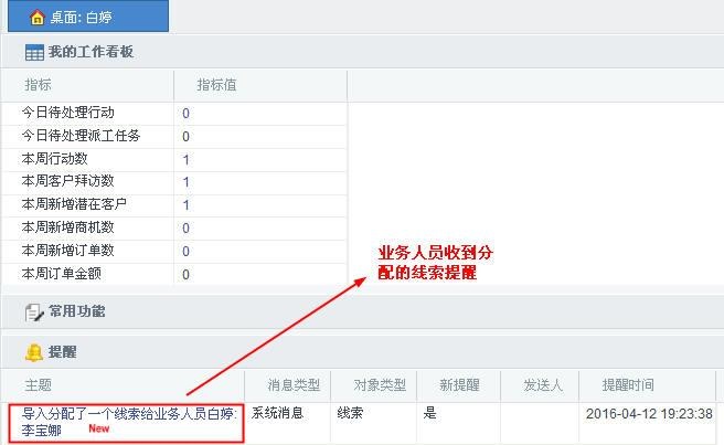 系统管理人员统一导入对象记录,有时需要提醒给相应的业务人员。以线索导入提醒给业务人员为例: