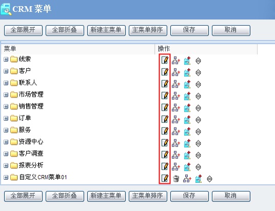 在 CRM 菜单列表页面中,单击 图标可直接打开对应 CRM 菜单的编辑页面,或点击 CRM 菜单名称进入其编辑页面即可对 CRM 菜单内容进行修改。