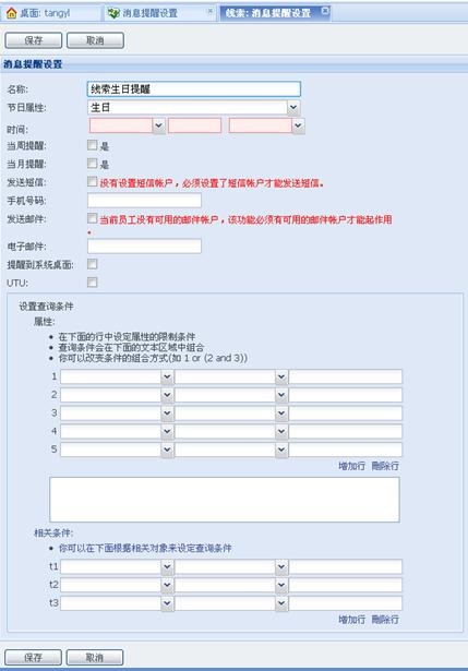 选中联系人后点击[下一步]按钮,设定该消息提醒的名称,选择该对象的节日型属性,设定提醒的时间,也可在下边的过滤条件中输入过滤条件,设置更加精确的提醒。设置完毕保存即可。