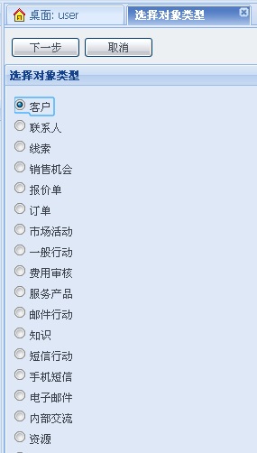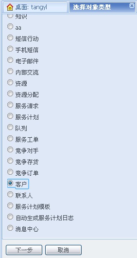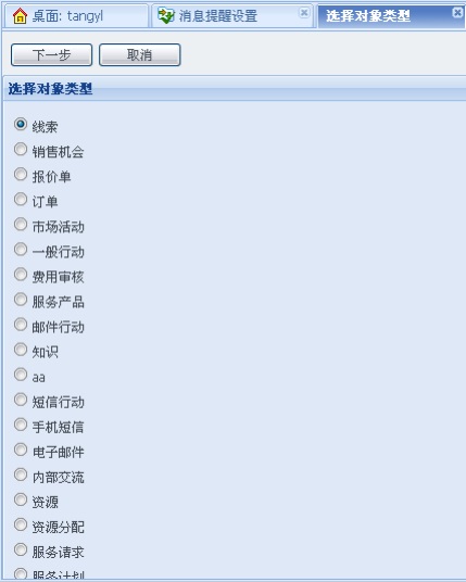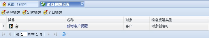 定时提醒主要用于提醒对象的日期时间型属性的消息提醒,以客户为例:点击[定时提醒]按钮,选择消息对象类型,本例中选择客户。