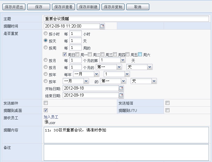 可提醒到桌面,发送邮件、短信提醒或提醒到 UU
