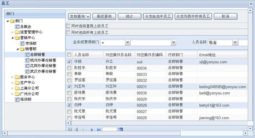 选择需要分发的人员,点击“分发给选中员工”即把指定的邮件分发给选定的人员。