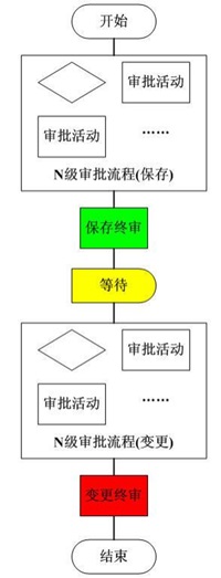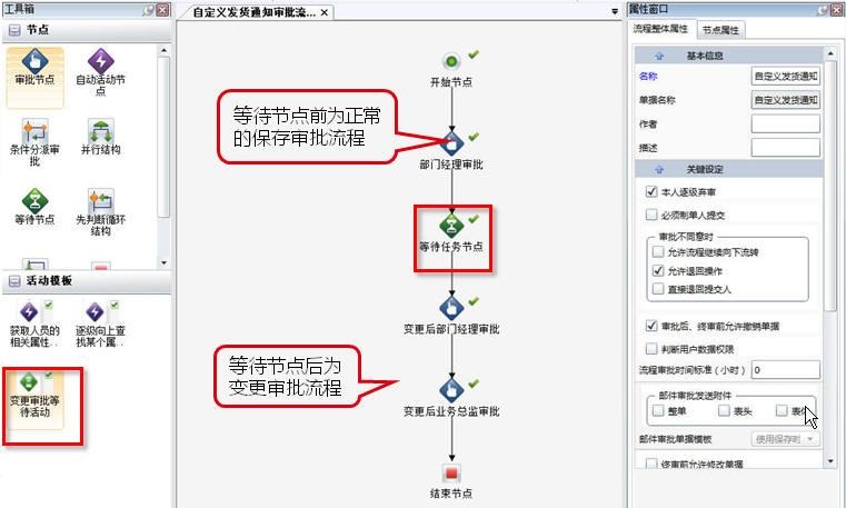 3. U8 工作流设计器中设置审批流程(正常审批流程后添加“变更审批等待活动”节点,接着再设变更审批流程节点)。