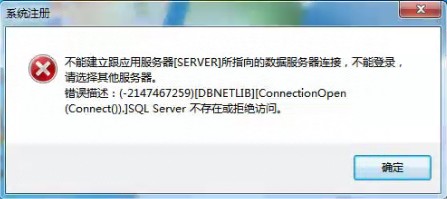不能建立跟应用服务器(PC201501231106)所指向的数据服务器连接,不能登陆,请选择其他服务器。错误描述:(-2147467259)(DBNETLIB)(ConnectionOpen(Connect()).SQL Server不存在或拒绝访问。