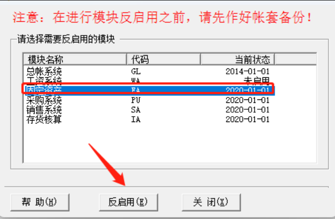 先备份账套---打开反启用工具,输入账套参数,选择固定资产模块,点击反启用按钮即可。