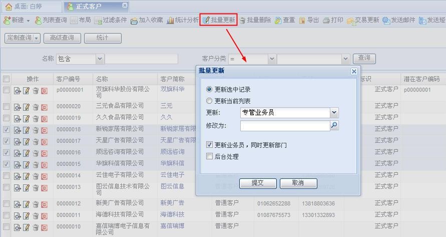 2. 当更新“专管业务员”时,可选择“更新业务员,同时更新部门”选项,即可实现更新客户记录的专管业务员的同时更新该客户的部门。