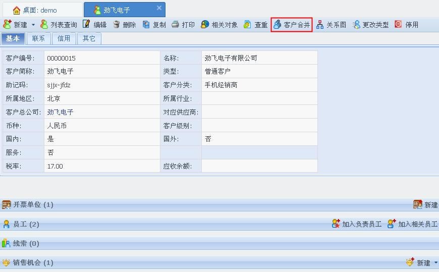 当客户数据记录录入有重复时,需要把部分记录的信息合并起来,客户查看页面提供了“客户合并”功能。