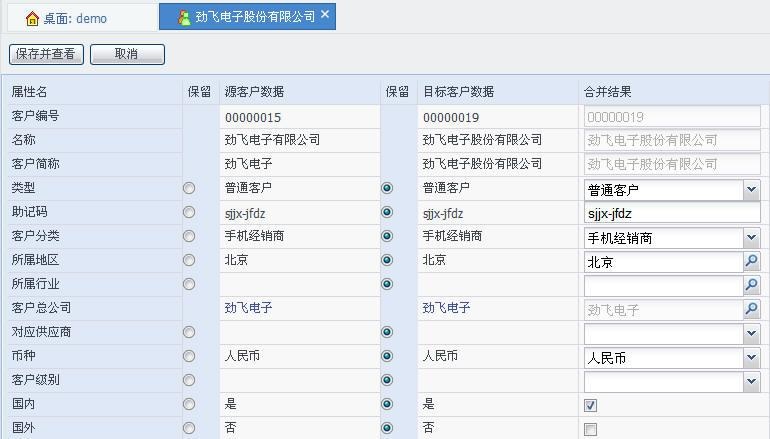 2. 选择目标客户后进入合并信息设置窗口, 设置合并数据信息,设置好后点击“保存并查看“即进入合并后的客户查看页面。