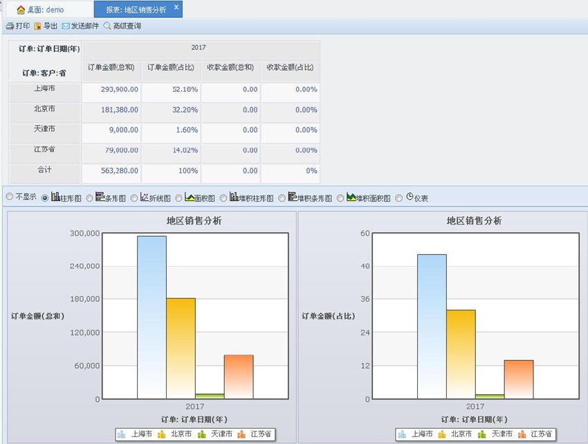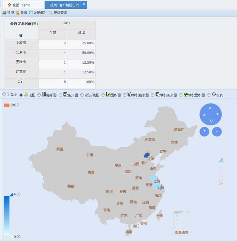 客户区域分析支持:客户地区分布、地区销售分析。
