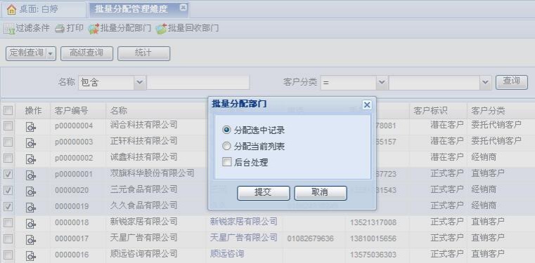 客户批量分配部门设置窗口中,确认设置后点击“提交”,进入选择部门页面,选择需要分配的部门后,点击分配按钮即可将部门分配给客户,分配后这些部门成为客户的相关部门。
