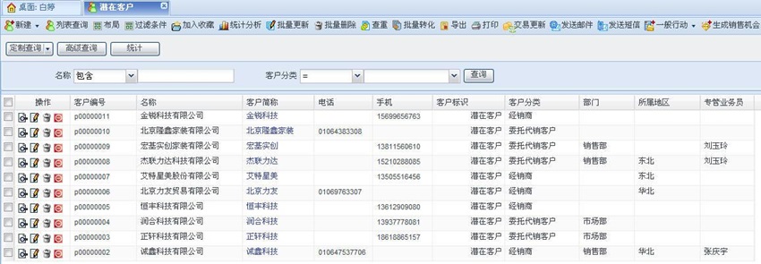 潜在客户列表页中可增删改查记录、加入收藏、统计分析、批量发送邮件短信、批量做行动、批量生成机会等,潜在客户的“批量转化”指批量转化正式客户功能。