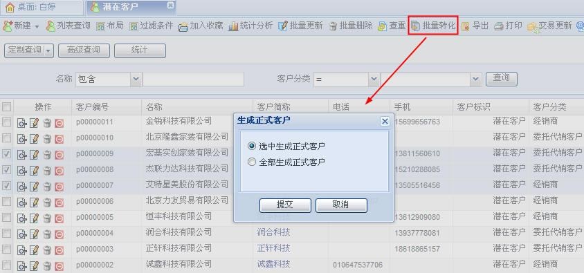潜在客户列表页面批量转化正式客户:进入潜在客户的列表页面,选择要批u量转化的记录,点击批量转化按钮,弹出批量转化设置窗口(如不选择潜在客户记录直接点批量转化则默认批量转化当前列表记录),确认是否是批转选中记录,如果是则直接点击提交即可批量转化。
