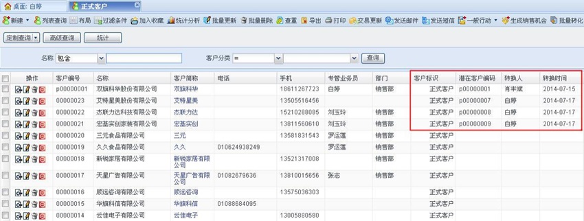 潜在客户转化为正式客户后,该记录列入正式客户列表。“客户标识”由潜在u客户变为:正式客户、 “转换人”记录转化操作人、“转换时间”记录转换时服务器时间、“潜在客户编码”记录源潜在客户的编号。