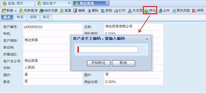 潜在客户查看页面单个转化正式客户:进入潜在客户的查看页面,点击转化u按钮,弹出输入编号的窗口,输入转化后的正式客户编号,点击开始转化即可。(如果正式客户编号是自动编号的,点击转化后不弹出输入编号的窗口,系统自动按规则取流水生成正式客户编号)