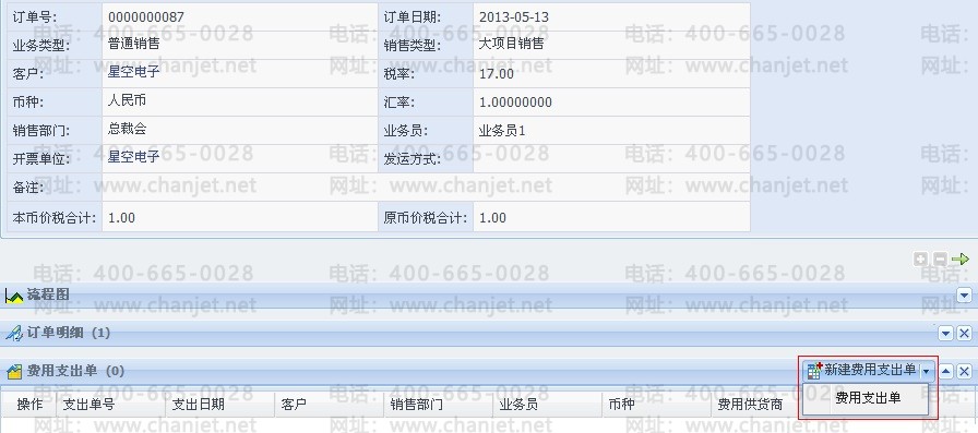 在订单的查看页面可以查看并新建相关的费用支出单,已审核未关闭的订单,可以在相关对象中新建费用支出单。点击“新建”并选择支出单类型进入费用支出单的新建编辑页面,系统自动携带订单的“客户、联系人、部门、业务员、付款条件”等信息到费用支出单上,携带信息可改。