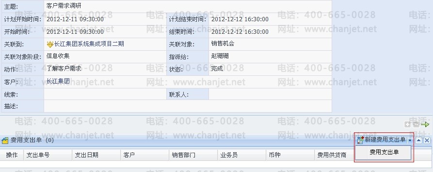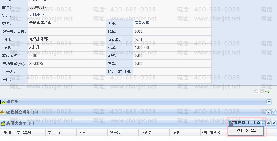 在销售机会的查看页面可以查看并新建相关的费用支出单,如果销售机会定义了工作流,则已审核未关闭的销售机会,可以在相关对象中创建费用支出单,否则销售机会保存后(未关闭)即可创建费用支出单。点击“新建”并选择类型进入费用支出单的新建编辑页面,系统自动携带销售机会的“客户、部门、所有者”等信息到费用支出单上,携带信息可改。