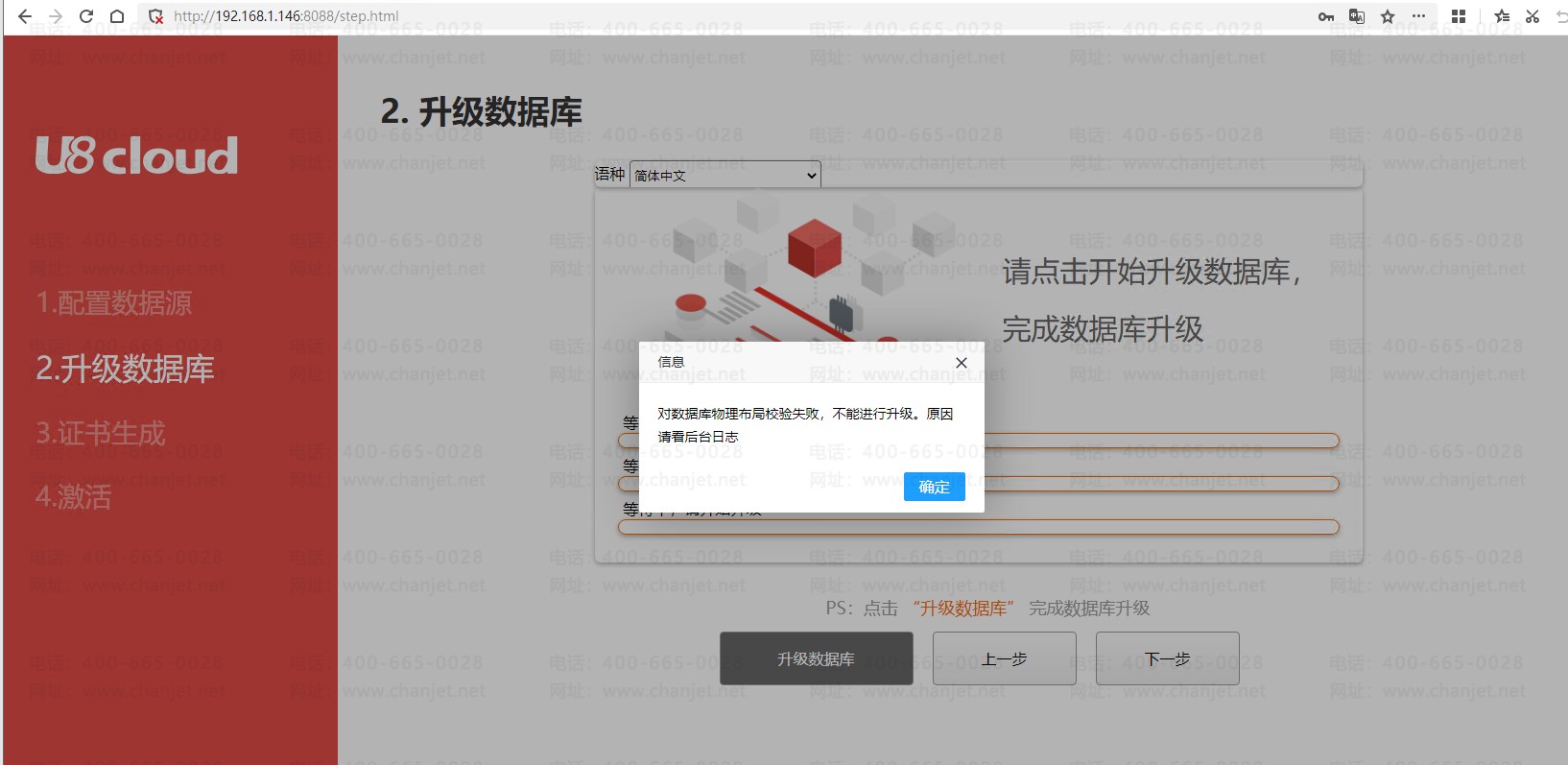 有客户问用友U8cloud V3.6的相关问题,在运行安装的时候,到升级数据库的时候提示“对数据库物理布局校验失败,不能进行升级。原因请看后台日志” 如下图所示;