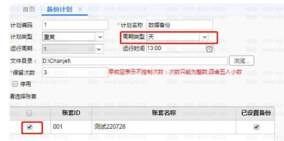 3.选中需要自动备份的账套,输入“计划名称”,“计划类型”默认选择“重复”,“周期类型”有天、周、月,可根据需要选择,“运行时间”就是指一天内什么时间来备份,建议是空闲时间,比如中午12点,或者下午18点,但是电脑一定是在开机状态,如果关了机,自动备份可能就会失效了。“文件目录”就是指备份文件放在哪个地方,可默认系统路径或者自行指定。注意“保留次数”,默认是0的话,就是保存每天的备份,不会覆盖与删除,这样备份数据就会越来越大。建议设置为1到3,假设保留次数为1,系统只会保留最新备份的文件,超出保留次数,按照近效保存优先原则,自动删除最早的备份。