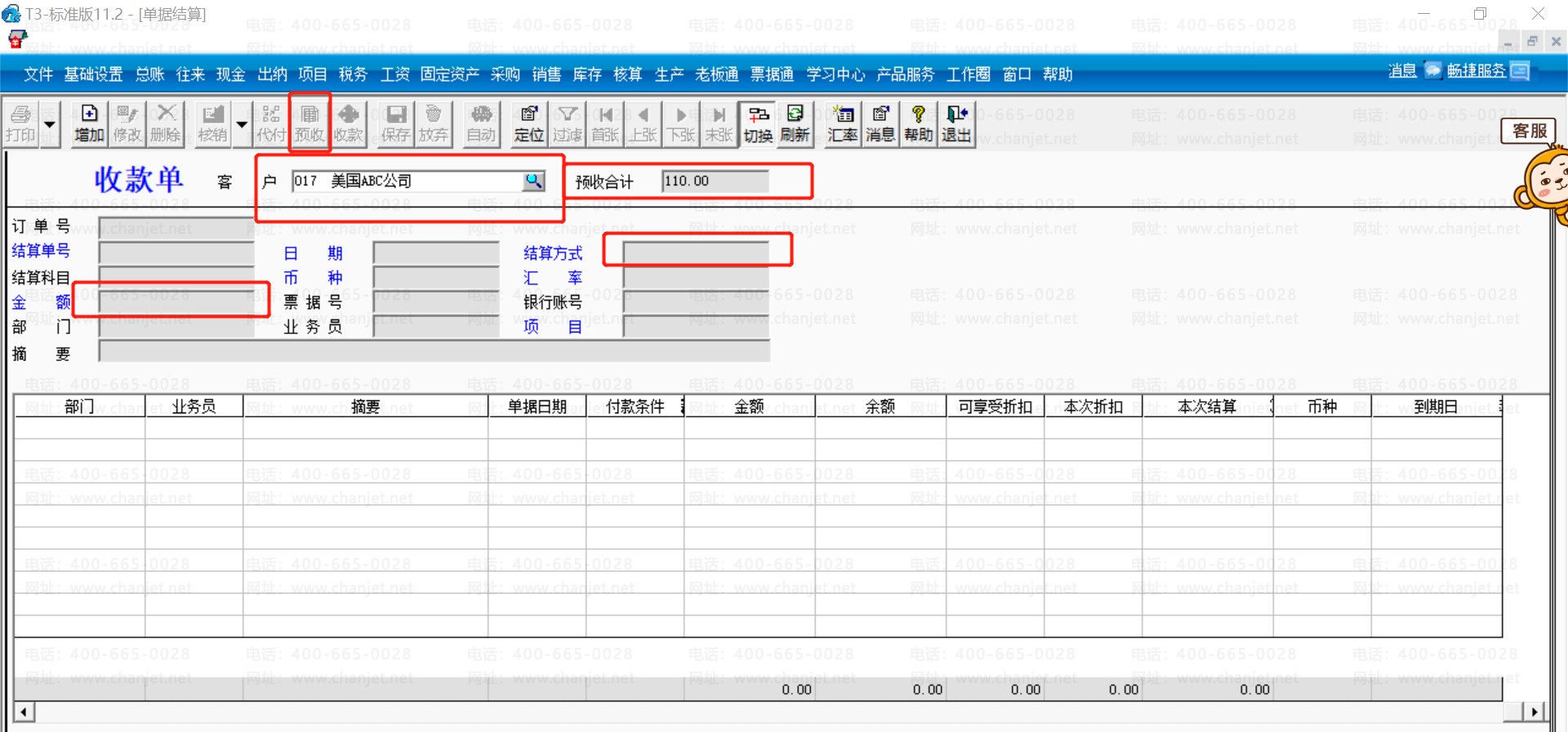②点击【销售管理】-【收款单】,选中对应的客户点击增加,填写表体【金额】和【结算方式】点击保存,再点击【预收】即可。