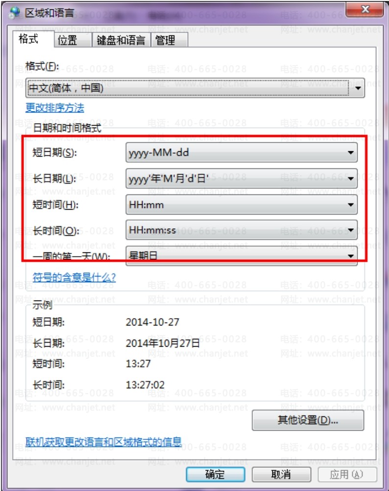 首先,依次点击进入“控制面板”并点击“区域和语言”。 将“短日期”格式设置为:YYYY-MM-DD;再将“长日期”格式设置为:“yyyy'年'M'月'd'日'”;时间格式为:HH:mm:ss .