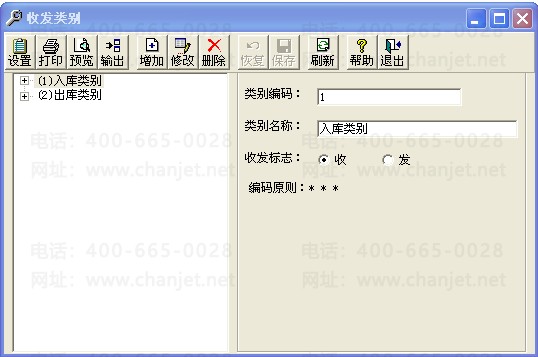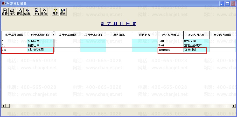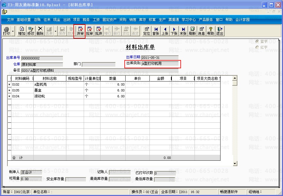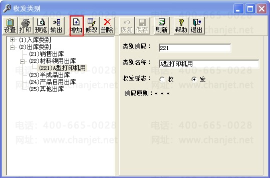 依次点击基础设置-购销存-收发类别-出库类别-材料领用出库,点击“增加”,增加个“A型打印机用”的出库类别。